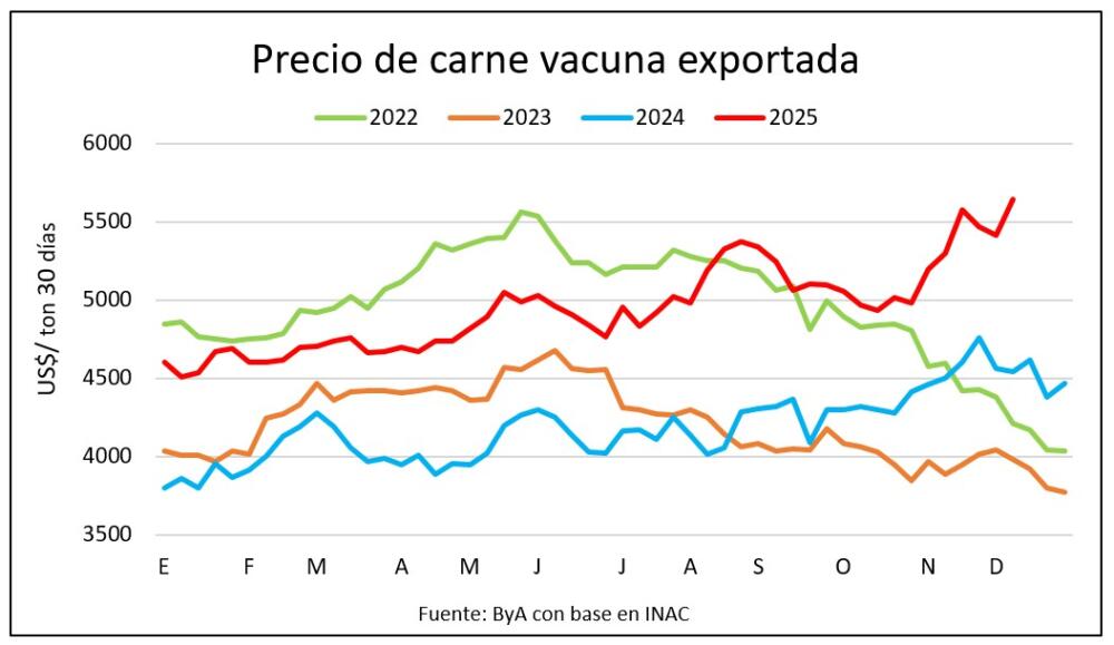 La tonelada de carne vacuna exportada en los últimos 30 días móviles sigue marcando máximos, con un promedio de US$ 5.647 por tonelada, valor superior al promedio deo de noviembre. En la última semana llegó a US$ 6.310 por tonelada, de acuerdo a los datos preliminares de INAC. En los...